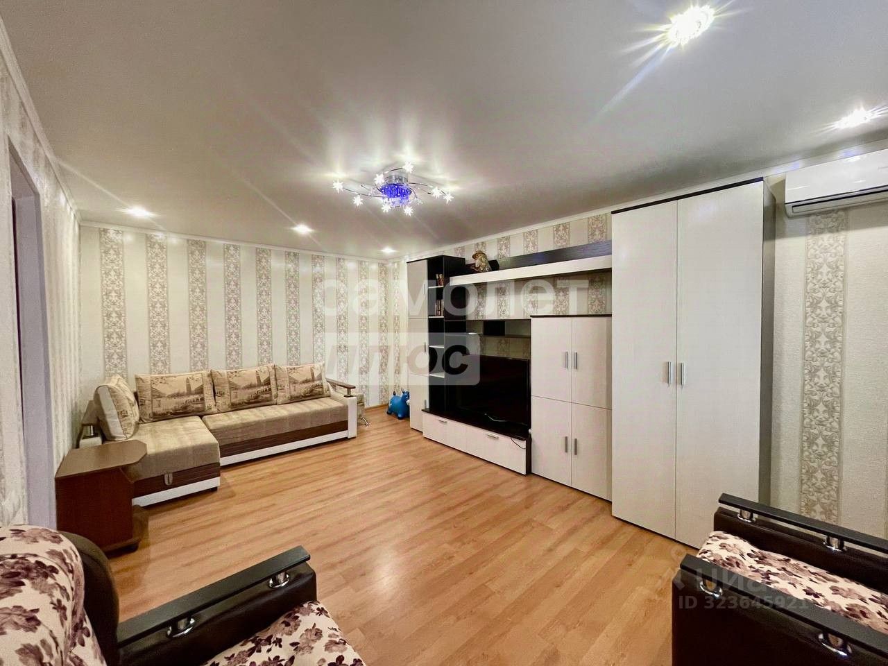 - Просторная гостиная с выходом на лоджию, оборудованная удобным диваном и телевизором.