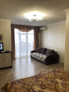 В комнате есть кондиционер, телевизор, комод, двуспальная кровать, большой раскладывающийся диван, журнальный столик.