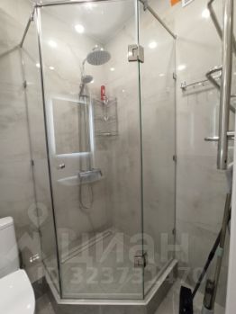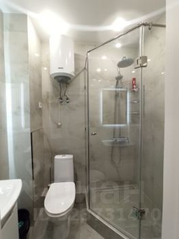 Санузел совмещённый с душевой кабиной, зеркалом, тумбой для хранения.