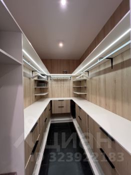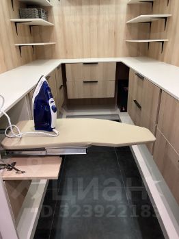 В гардеробной есть гладильная доска, пылесос, сейф, вешалки и полочки для одежды.