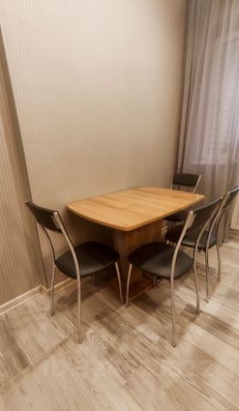 В кухне качественный и вместительный кухонный гарнитур, электрическая варочная панель, микроволновка, чайник, вытяжка, раскладной стол, стулья. Кухня укомплектована всем необходимым: тарелки, кастрюли, сковорода, приборы, ножи, стаканы, бокалы и тп.