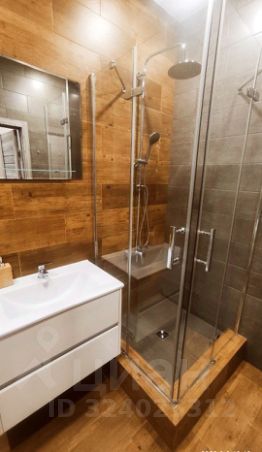 В ванной комнате стиральная машина, душ-подиум, тумба. Балкон: застекленный балкон