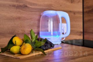 На кухне новая современная техника, СВЧ, холодильник, чайник, плита, полный набор посуды