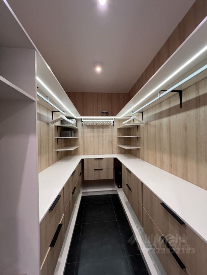 В гардеробной есть гладильная доска, пылесос, сейф, вешалки и полочки для одежды.