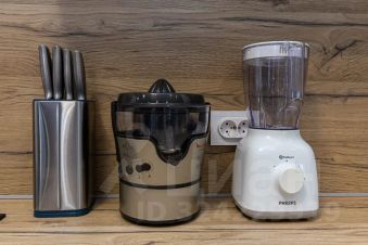 Полностью оборудованная кухня: эл. плита, холодильник, микроволновка, блендер, соковыжималка, электрочайник, необходимая посуда, стиральная машина.