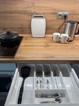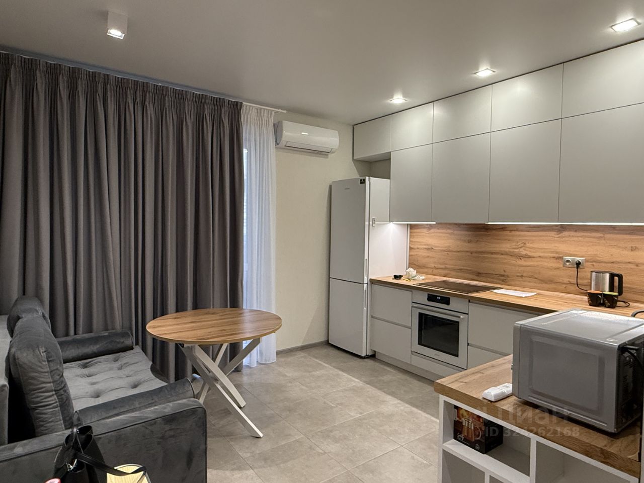 Просторная кухня-гостиная оборудована посудомоечной машиной, удобной рабочей зоной и раскладывающимся диваном с анатомическим матрасом — идеально для гостей или дополнительного места.