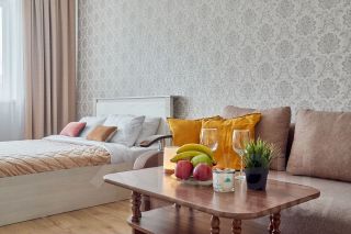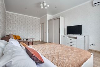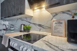 В апартаментах есть всё, чтобы вам было уютно и комфортно как дома. В квартирах выполнен европейский ремонт и создан стильный интерьер. Панорамные окна открывают чудесный вид на центр города. Современная кухня оборудована всей необходимой бытовой техникой (холодильник, микроволновая печь, индукционная плита с сенсорным управлением, чайник), в ней также имеются посуда и столовые приборы. В комнате стоит большая удобная кровать с ортопедическим матрасом , на кухне раскладывающийся двухспальный диван.