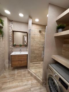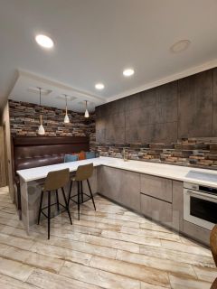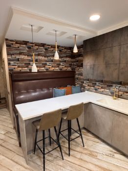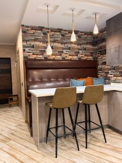 Теплые полы, кухня с каменной столешницей, диван для кухни ручной работы в стиле ирландского паба, отсутствие батареи перед витражным окном, установлен напольный конвектор, унитаз с инсталляцией, наличие разных шкафов для вещей и всё это в однокомнатной евродвушке!