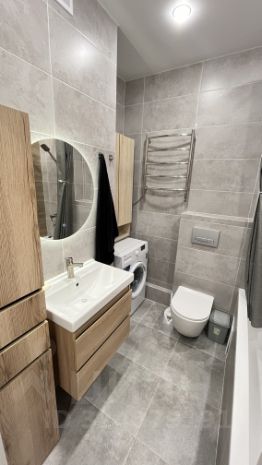 - Ванная комната со стиральной машиной, инсталляцией, зеркалом с подсветкой, удобными шкафами для хранения и самой ванной.