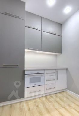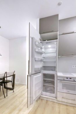 —Кухня: Встроенный холодильник с морозильной камерой, индукционная плита, вытяжка, духовой шкаф с функцией микроволновки.