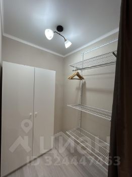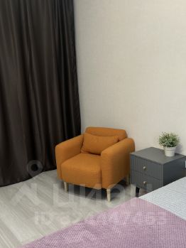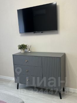 - в комнате большая двуспальная кровать, стильный комод, удобное кресло, тумба, зона гардеробной, сплит-система, телевизор;