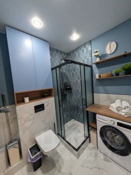 В ванной всё, что нужно: душ, полотенца, средства гигиены, стиральная машина и полочки для твоих мелочей.