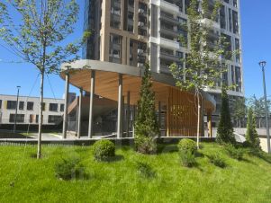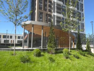 Территория оснащена стилобатами, на которых имеются: детская площадка, лежаки, тренажёры, футбольное поле, места для отдыха/работы/учёбы.
