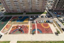 Рядом с домом современная детская площадка, зона с турниками и тренажерами, зона для отдыха.
