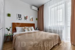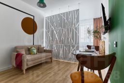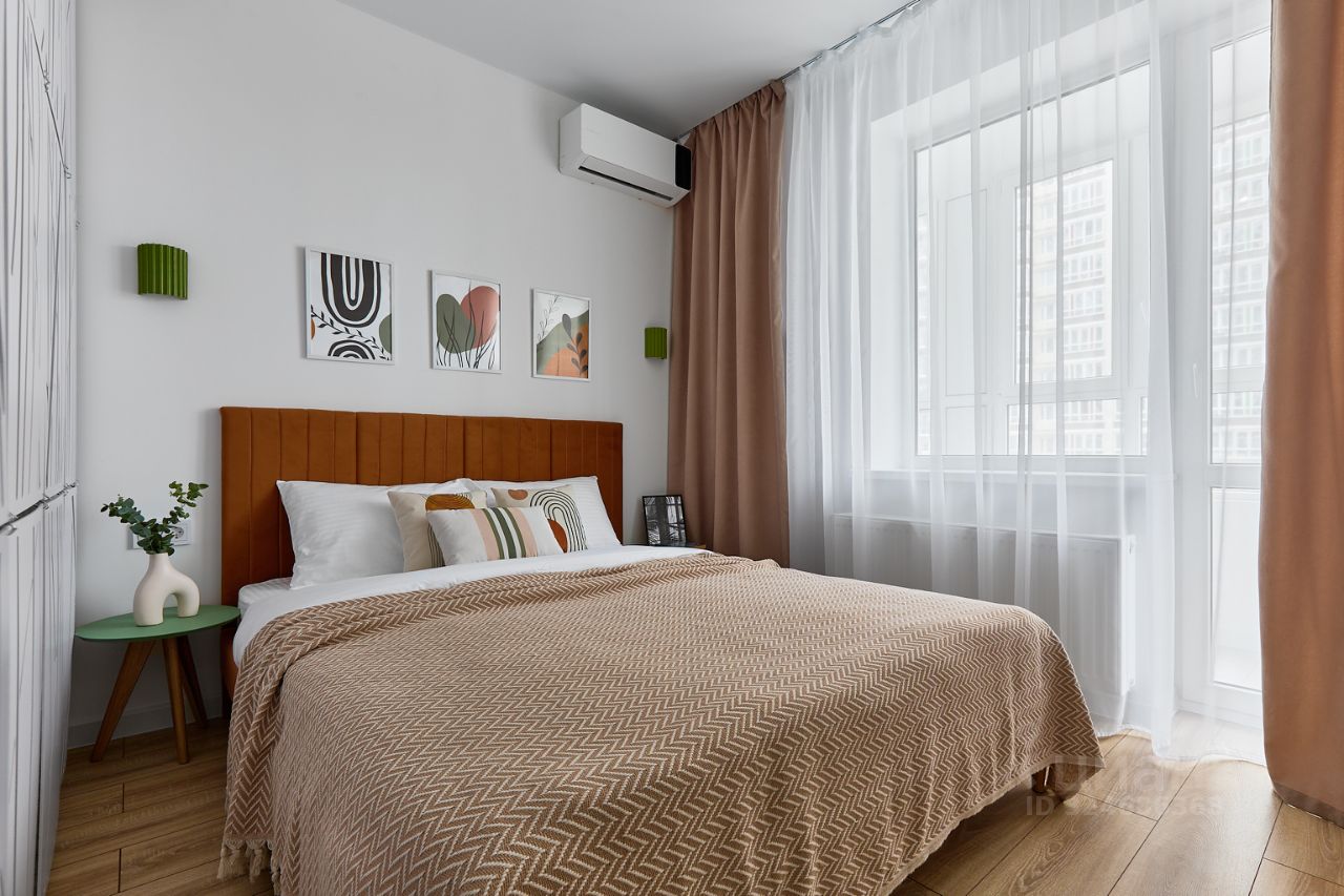 - Спальная зона: кровать 160200 с ортопедическим матрасом, smart-телевизор, сплит-система, затемняющие шторы блэкаут. Дополнительно: диван-кровать 140200.