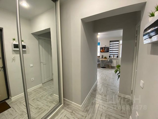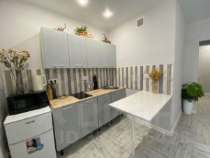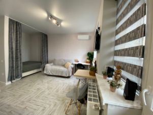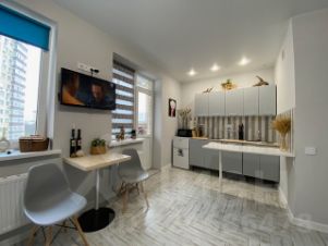 В квартире сделан качественный евроремонт, установлена современная мебель как в комнате, так и на кухне. Просторный совмещённый санузел оборудован ванной. Из техники есть всё необходимое: кондиционер, холодильник, телевизор, микроволновка, стиральная машина и чайник, что делает проживание более удобным.