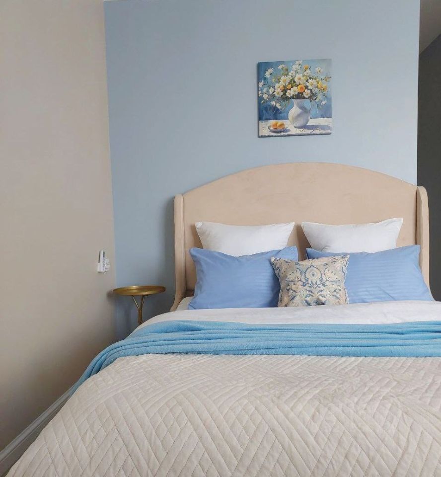 - Стильный интерьер в нежных оттенках голубого, дарящий атмосферу спокойствия и уюта.