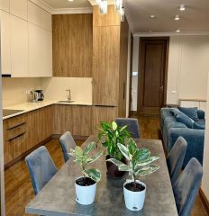 Сдаётся просторная Евро 3-комнатная квартира в самом сердце Краснодара, в микрорайоне Центральный, на улице Кубанская Набережная, 3. Квартира расположена на 17-м этаже 21-этажного монолитного дома 2018 года постройки. Общая площадь квартиры составляет 150 кв. м, с жилой площадью 95 кв. м и огромной кухней в 50 кв. м. Высота потолков — 3.45 метра, что создаёт чувство простора и свободы.