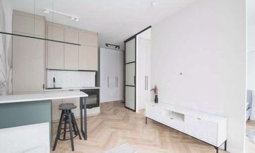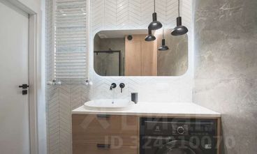 Душевая кабинка со стеклянными стенками, стиральная машина решает вопрос стирки. Подвесная раковина с широкой тумбой дает возможность аккуратно разместить косметику. Настенный унитаз облегчает уборку.