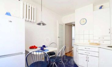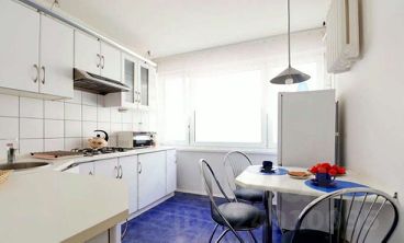 На кухне вы не испытаете нехватки места. Длинная столешница позволит разложить все необходимое для готовки, чтобы ничего не мешало под рукой. Плита газовая. Есть микроволновка и холодильник. Обеденный столик рассчитан на 4-х человек.