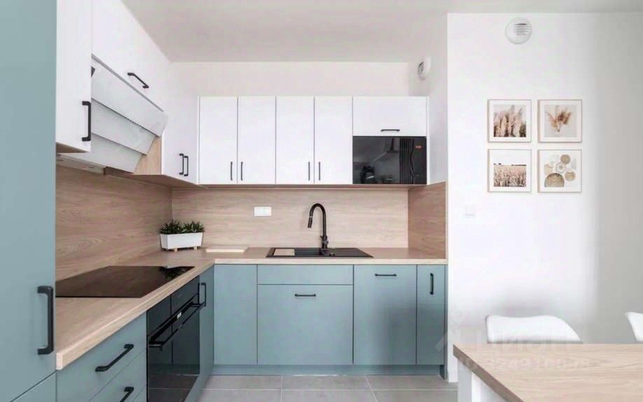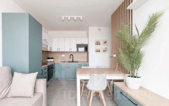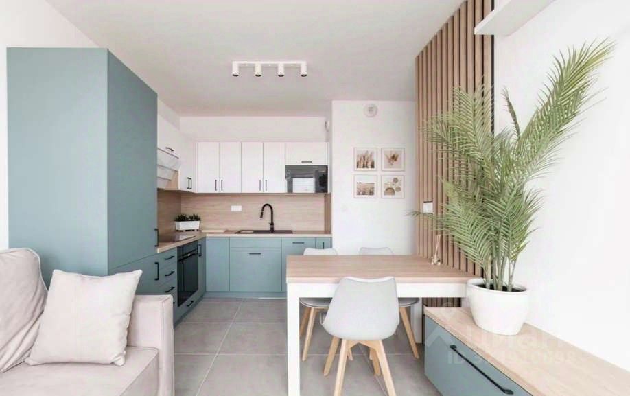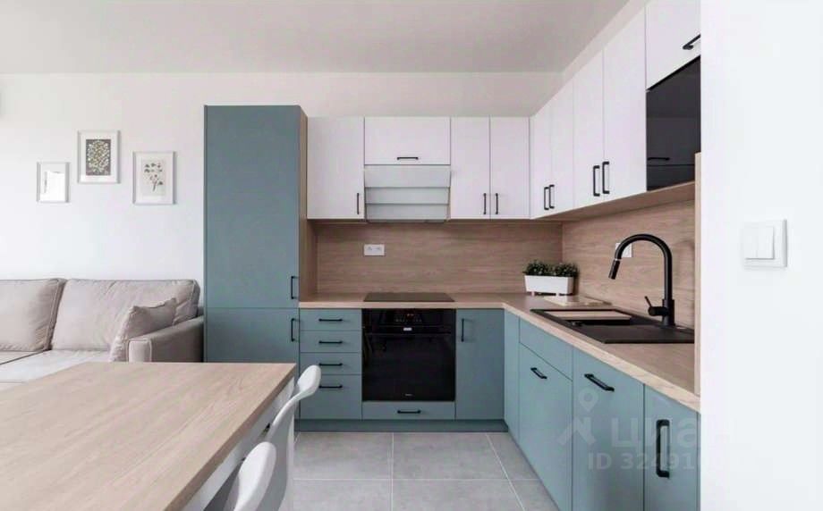 Кухня совмещается с гостиной. Выполнена в пастельно-голубых тонах в комбинации с белым. Варочная панель электрическая, сенсорная. Есть духовка. Микроволновая печь встроена в фурнитуру, а вытяжка складывается гармошкой для экономии места.