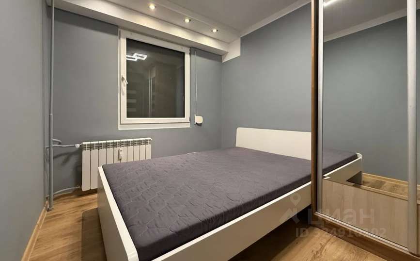 Первая спальня, в ее пределах двухместная кровать с мягким матрасом на независимых пружинах, шкаф-купе и письменный стол.