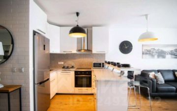 Кухня объединена с гостиной и отделяется лишь столешницей. Пространство для готовки имеет все оборудование для широкого спектра возможных к приготовлению блюд.