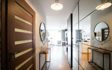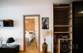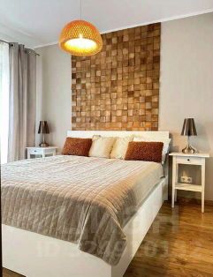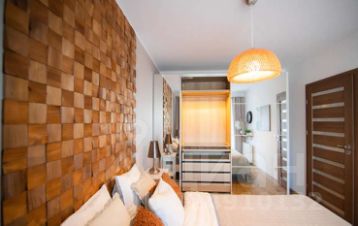 Следуя по длинному коридору, дополненному раздвижными шкафами для уличного и домашнего гардероба, вы попадете в спальную комнату. На двухместной положен высокий матрас средней плотности. Дополнительно предоставляется комплект постельного белья. Все чистое, новое. На прикроватных столиках ночные лампы для каждой стороны, чтобы не мешать друг-другу. Можно положить телефон, наушники и другие гаджеты. Возле стены еще одно пространство для одежды с включающейся подсветкой при открытии.