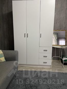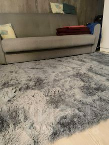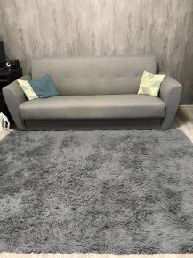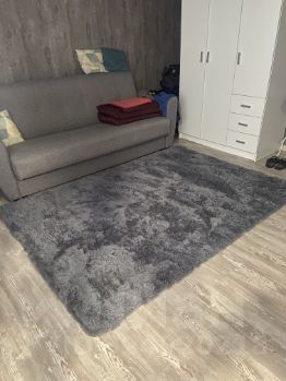 В жилой зоне - диван, который раскладывается, шкаф, пушистый серый ковер и небольшой компьютерный стол.