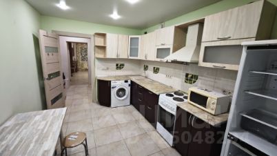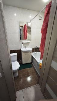 Кухня оборудована всем необходимым: холодильник, плита, микроволновая печь и стиральная машина. Есть обеденный стол и стулья. Санузел совмещенный, оснащен ванной и раковиной.