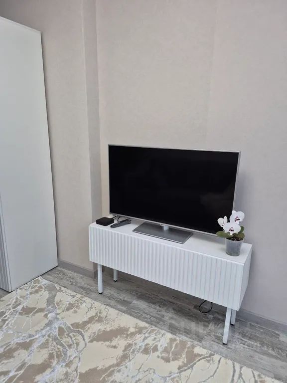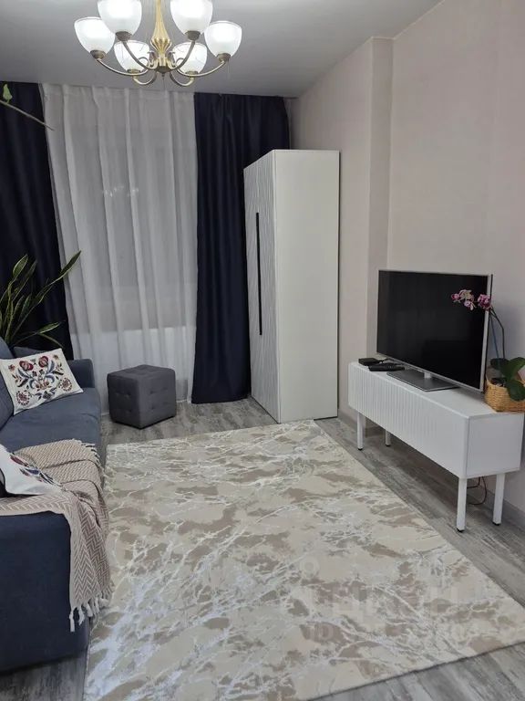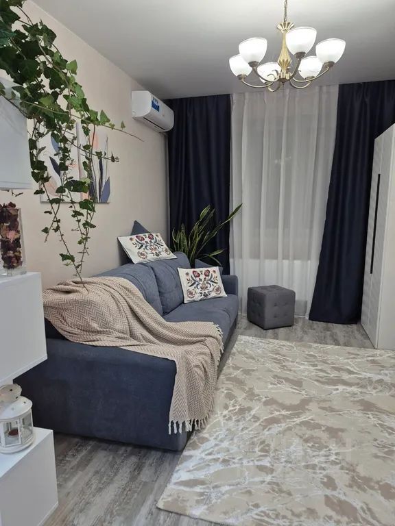 В гостиной зоне — мягкий диван, современный телевизор, кондиционер, приятное освещение. Кухонная зона оборудована обеденным столом и удобными стульями — идеально как для завтраков, так и для ужинов. Большие окна с тюлем наполняют квартиру естественным светом.