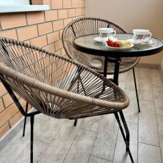 В апартаментах есть всё необходимое, большая удобная кровать с ортопедическим матрасом, и два раскладывающиеся двуспальных дивана. Кухня с необходимым набором посуды и столовых приборов, техникой (холодильник, свч-печь, чайник, плита с духовым шкафом)