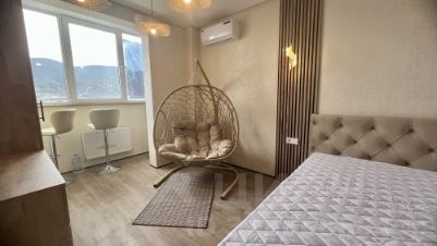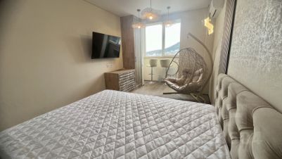 Спальня: двуспальная кровать (парящая) с подсветкой, подъемный механизм, кресло подвесное, барные стулья у окна, чтобы любоваться видами на горы и море.