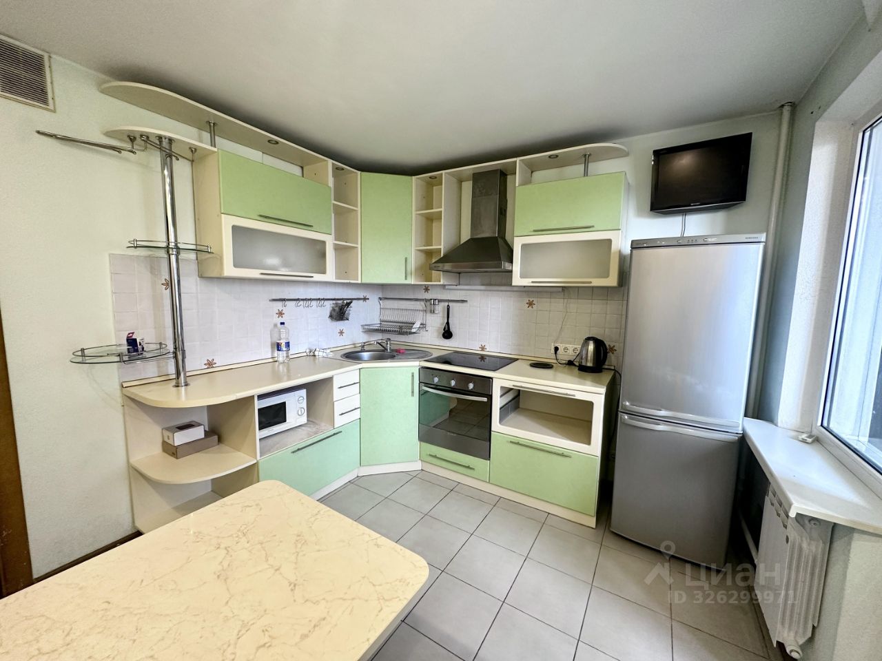 Квартира оборудована всей необходимой техникой: есть кондиционер, холодильник, телевизор и стиральная машина. Мебель на кухне и в комнате позволяет сразу же заселиться без лишних хлопот. В ванной комнате установлена ванна, что позволяет расслабиться после долгого дня.