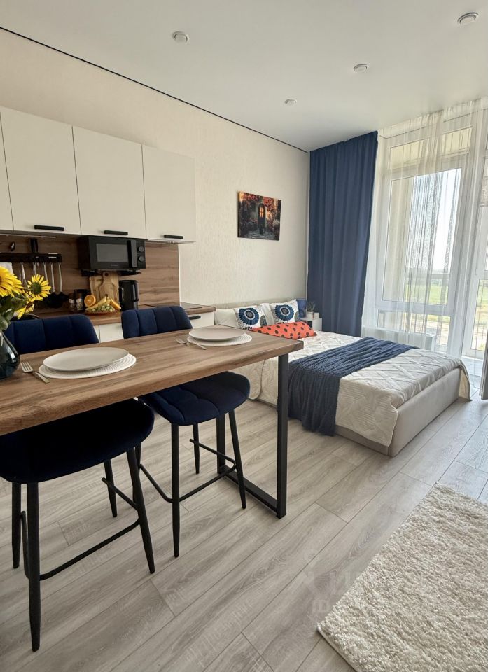 Большая кровать с ортопедическим матрасом, шкаф для одежды, диван для отдыха/работы, современная кухня, барная стойка.