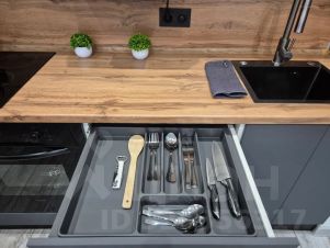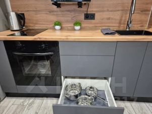 Полностью оборудованная кухня с современной техникой (холодильник, плита, микроволновка) и всем необходимым для приготовления пищи.