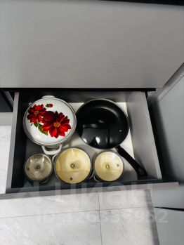Кухня с посудой для комфортного приготовления пищи, (варочная панель духовой шкаф, микроволновая плита, холодильник, посудомоечная машина, кофе, чай, сахар, соль, масло для жарки)
