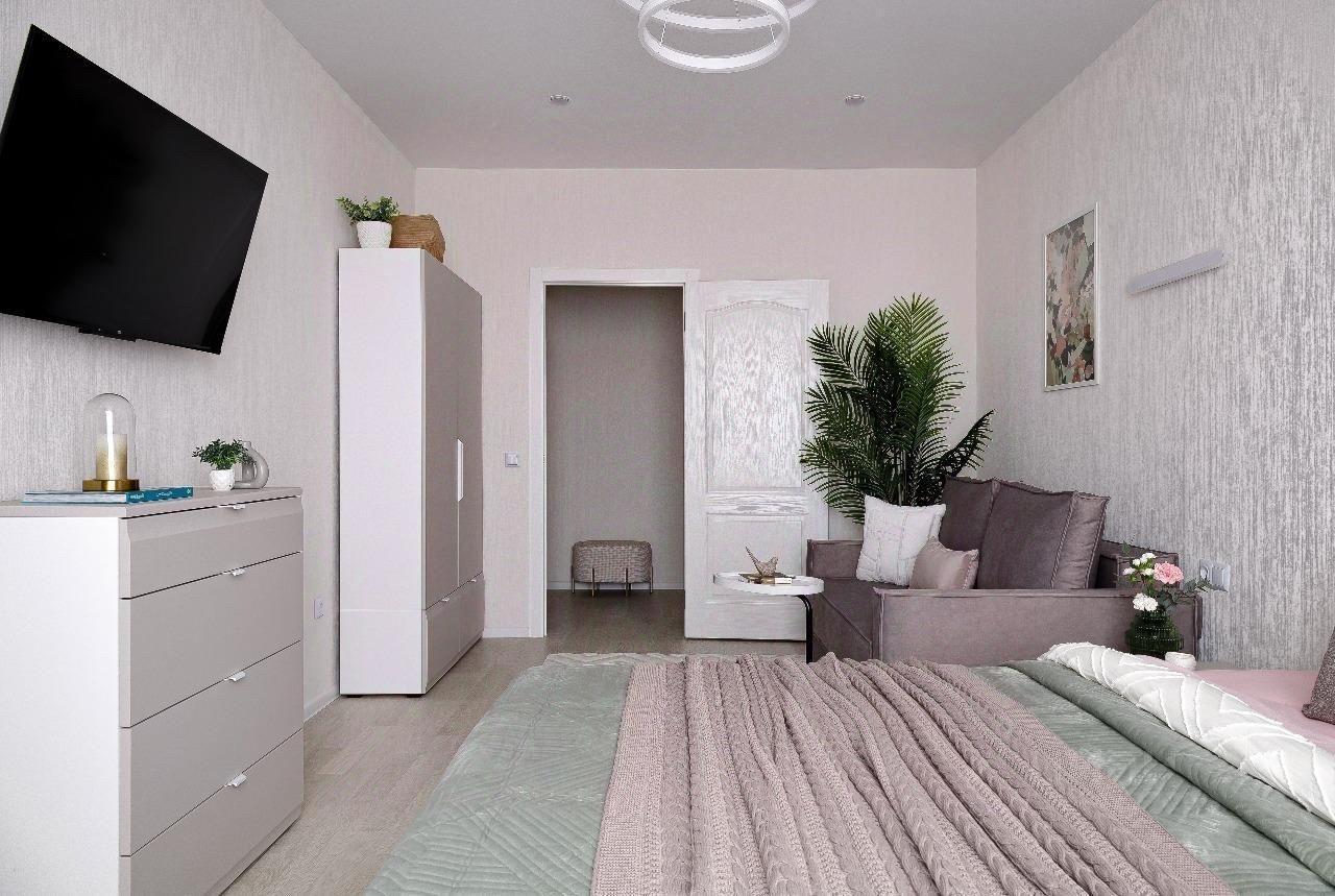 - Полная готовность к заселению:двуспальная кровать 160200 см, раскладной диван (спальное место 140 см), кухонный гарнитур, техника (холодильник, стиральная машина, ТВ), гардеробная система.