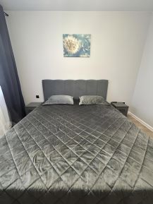 В спальне большая кровать 200*180, две тумбы, телевизор 55 с поддержкой Алисы. Удобный большой матрац , одеяло , подушки, покрывало. Из окон открывается вид на детскую площадку и зелёные насаждения. Санузел совмещённый, оформлен в современном стиле.Есть стиральная машина, полотенцесушитель, фен. В коридоре огромный вместительный шкаф-купе, а также шкаф в прихожей. Гладильная доска, утюг . Вся техника и мебель новая. В квартире проведен и подключен скоростной интернет . На балконе имеется сушилка для белья .