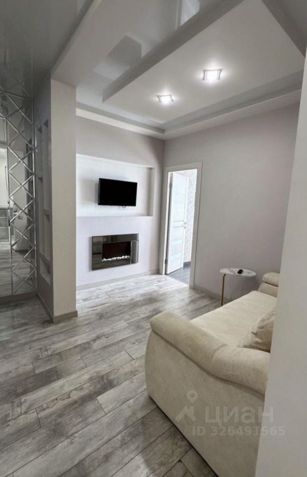 Коридор отделен аркой , с небольшой (проходной ) гостиной,в которой располагается раскладной двухместный диван и тв зона , декоративный камин.