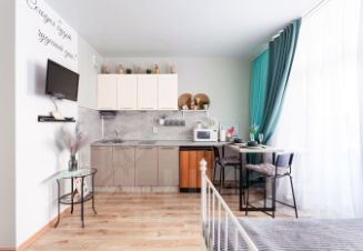 Кухня оборудованна всем необходимым: холодильник, микроволновая печь, чайник, варочная панель, полный комплект посуды, фужеры, сковородки, кастрюли