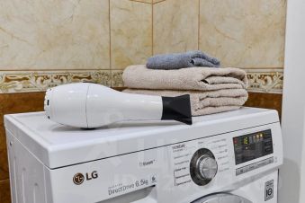Утюг, фен и сушилка для белья, стиральная машина, просторная ванная комната и большая ванна, для того чтобы вечером расслабиться.