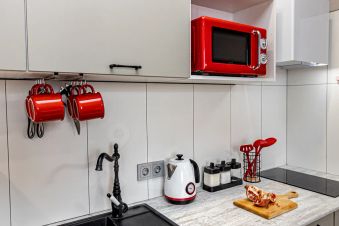 В студии предусмотрены 4 спальных места: 2-х спальная кровать (145*195) и раскладной диван (130*195). Приятные мелочи интерьера окунут вас в атмосферу ретро в современном комфорте!