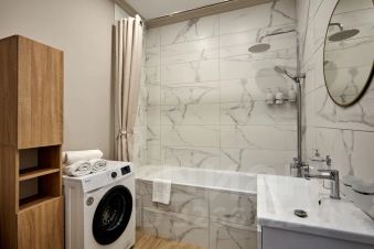В ванной комнате подготовлен комплект полотенец для каждого гостя, средства гигиены, стиральная машина, сушилка для белья, утюг, гладильная доска,