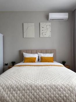 - Техника: смарт ТВ, сплит-система, микроволновая печь, вытяжка, утюг, в ванной тропический душ.