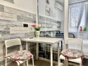 Кухонная зона оснащена индукционной электроплитой, вытяжкой , электрочайником, холодильником, микроволновкой, столовыми приборами и посудой, столом и стульями.
