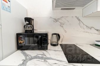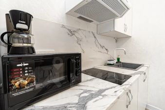 Кухня оснащена всем необходимым для приготовления и приема пищи, с необходимой посудой, электрочайником, кофеваркой, свч-печью и холодильником.
