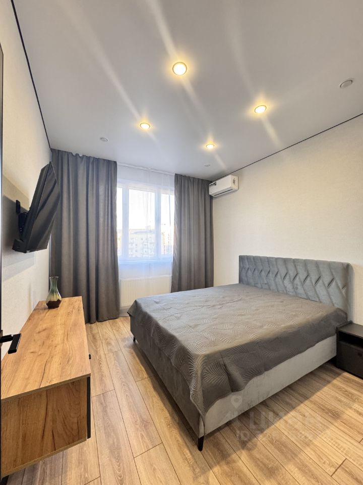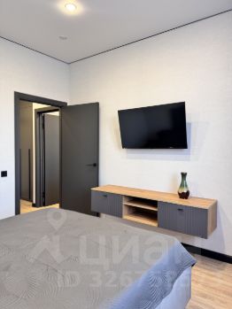 В спальне телевизор, большая кровать.