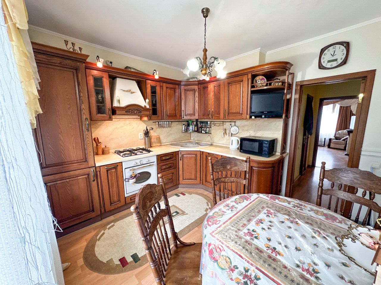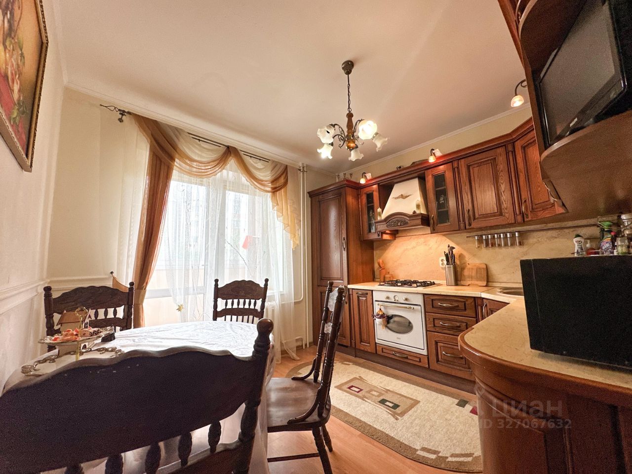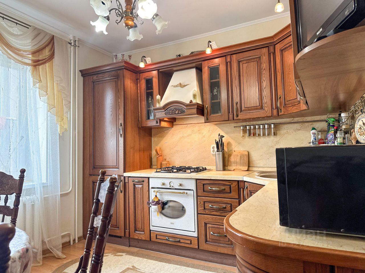 Кухня площадью 15 м² оборудована всем необходимым: холодильник, плита, микроволновая печь и посудомоечная машина. Из окон открывается вид на зеленый двор, где есть открытая парковка.