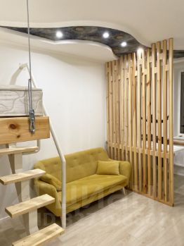 Под кроватью размещается уютная зона отдыха с качелями. В комнате есть стильный нераскладной жёлтый диван и большой зеркальный шкаф для вещей. Также комната зонирована реечной перегородкой, которая отделяет просторную рабочую зону с большим угловым столом и компьютерным креслом.